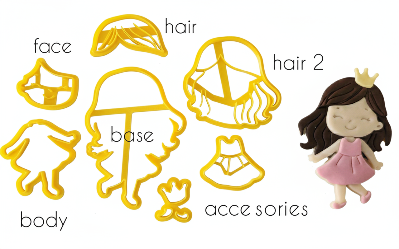Comes with various cutters to make a fondant girl to decorate cakes